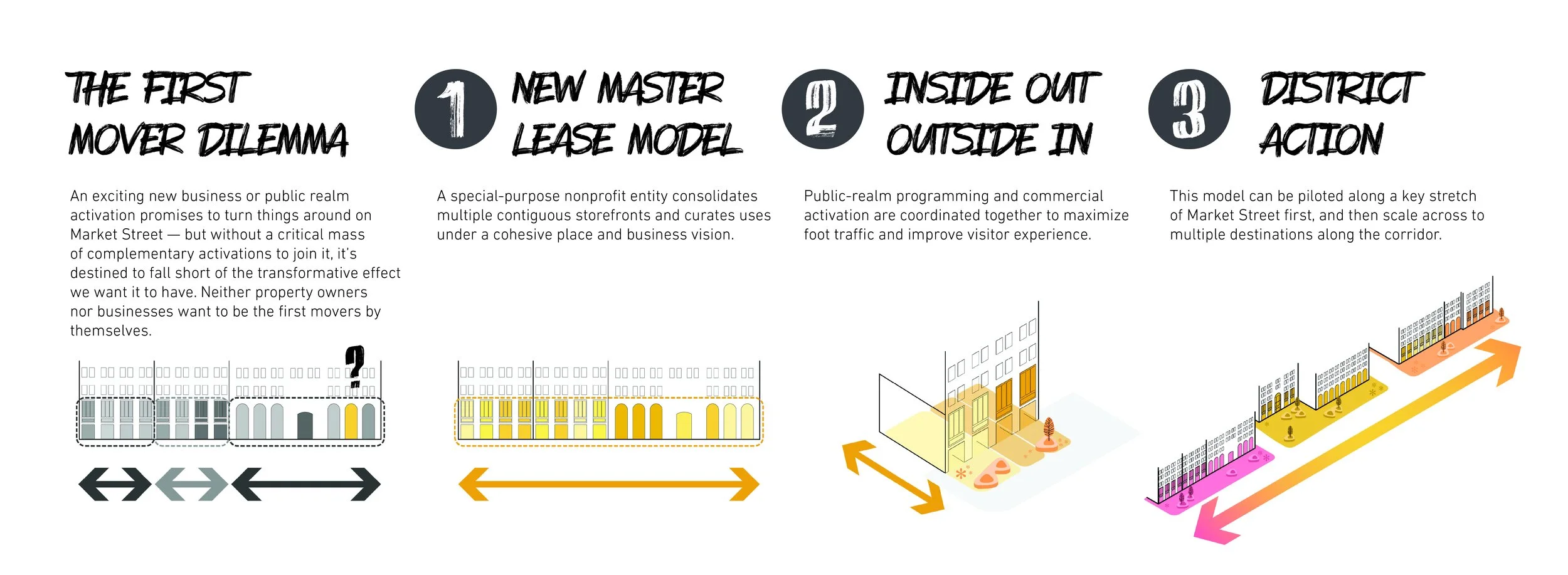 The Ground Floor Collective is a catalytic platform for place —curating storefronts and public space together to build momentum on Market Street. Through a master lease of the ground floors of multiple properties across disparate property owners, it brings new life to underused spaces with a carefully considered mix of tenants and street-level programming — making Market Street a place to be, not just a place to pass through.